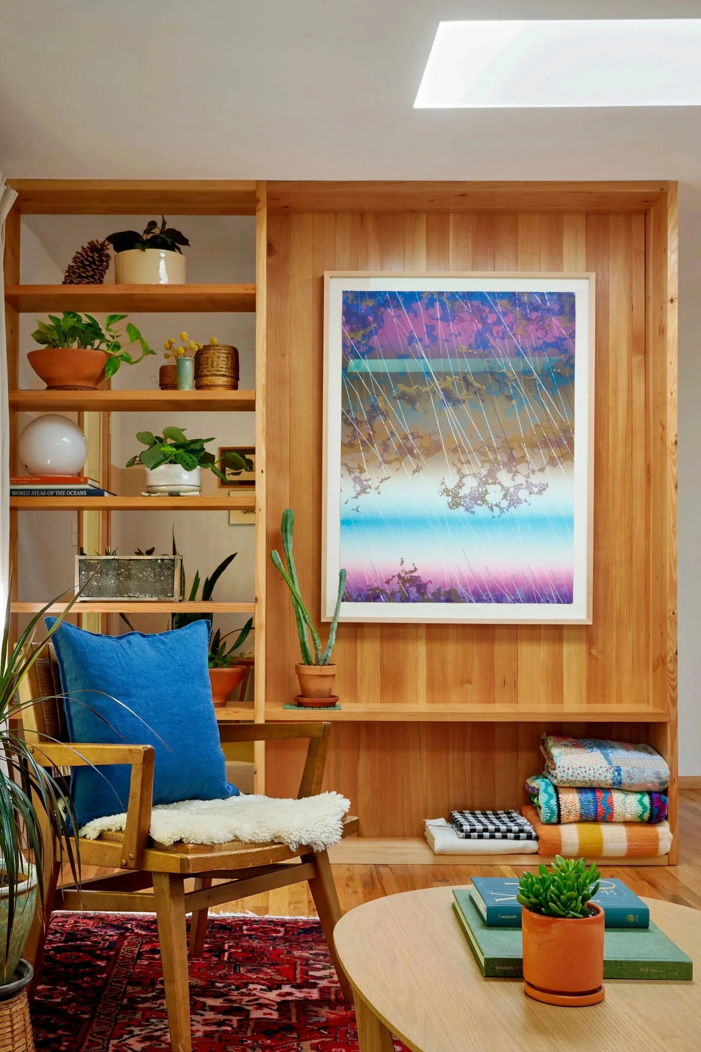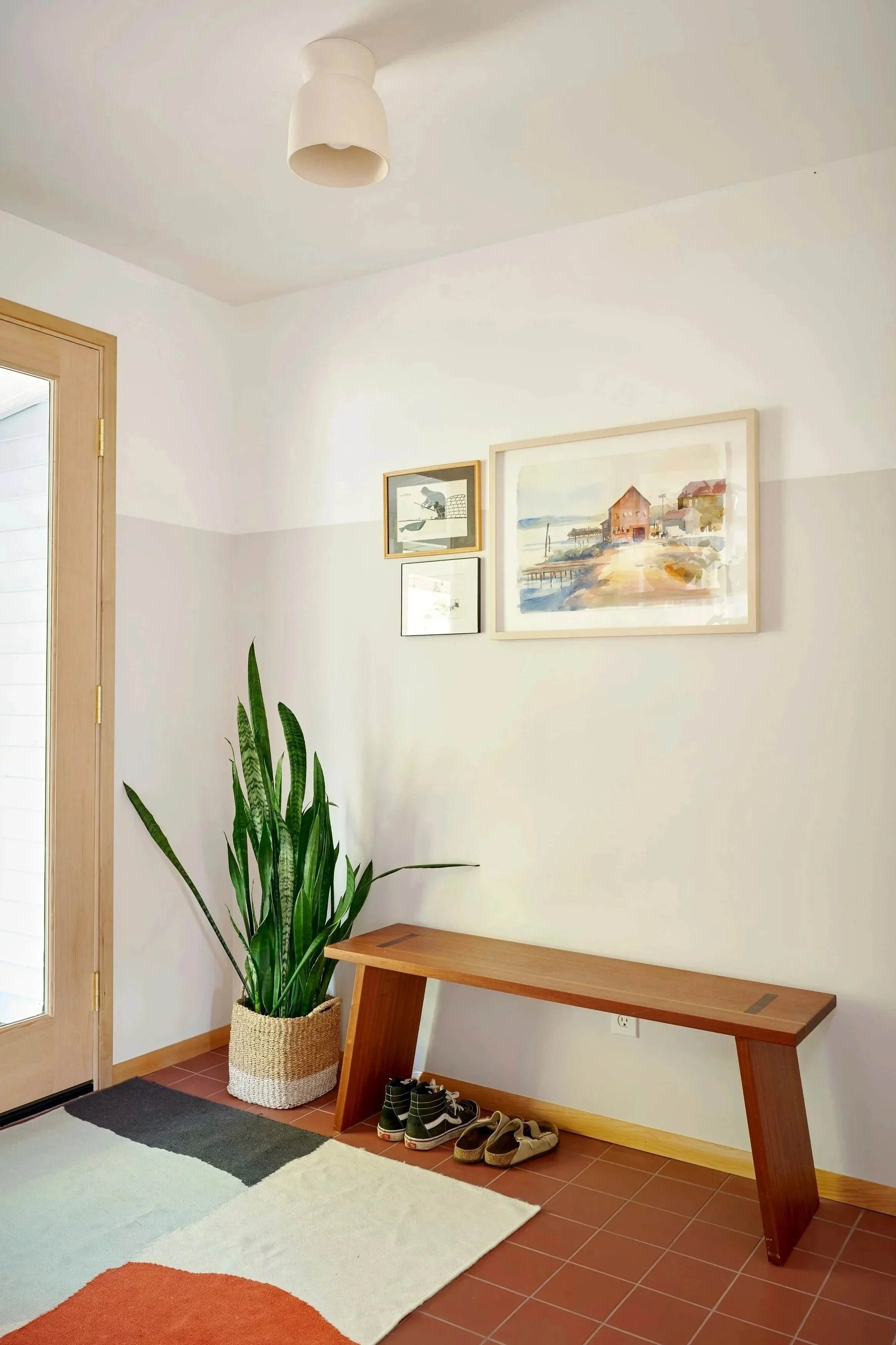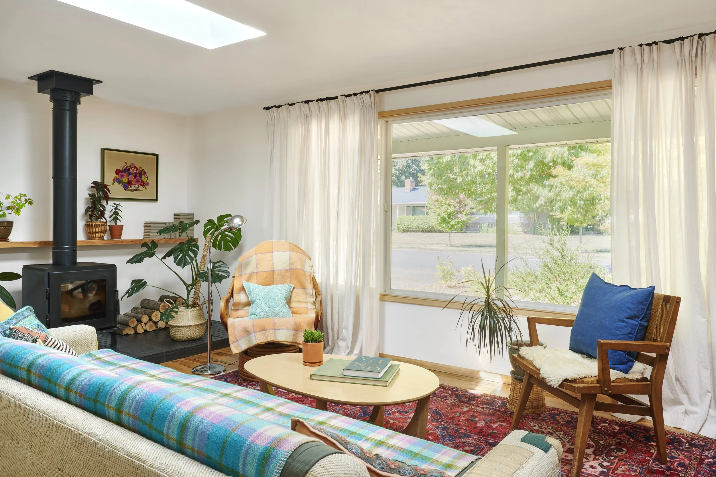 This family wanted clearer boundaries in their home — tired of shoes and coats spilling from the entry into the living room and a living room that was dim and never felt quite right. A built-in and tile flooring help redefine the entry, while a wood stove for emergency heating helps cozy up the living room. Recessed lights were replaced with new skylights that provide ample daylight deep into the space even on our cloudiest of days. A commitment to healthy materials includes FSC‑certified Douglas Fir, low‑VOC paint, cradle‑to‑cradle certified tile and refinishing the home’s original hardwood floors that were discovered below layers of vinyl and tile. The result is brighter, more intentional spaces that support this family’s daily life, their sustainability values and connect them to nature.